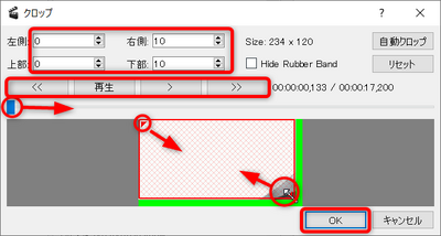 - クロップの設定をする。左上と右下に赤三角になっている赤枠の大きさを調整することで変更できます。左上の左/右/上/下に数値を使って調整もできます。シークバーの青色をスライドするとか、「<<」「再生」「>」「>>」を使って、クロップの出来栄えを確認することもできます。設定できたら「OK」ボタンを押して終わらせます。