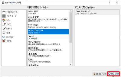 - クロップの項目が出来上がっているのを確認して、「閉じる」ボタンを押す。