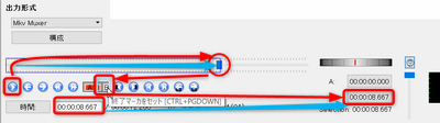 - 再生ボタンを押して、動画の終わりの位置まで再生して、再生停止をして、微調整をしたりして、納得のいくポイントを探します。そうしたら、動画の終わりを設定する[Aと書いてある隣の]ボタンを押します。再生シークバーに青い枠がついて、切り取られるおおよその目安となるマークがされます。Bと書いてある時間表示欄に後方の映像を切り取りたい時間が取り込まれて表示されます。前方を切り落として再生開始部分を変える場合はAと書いてあるボタンを使います。再生ボタンで位置合わせした場合は確実に位置調整ができますがシークバー上の青いマークを直接移動させた場合はうまく行かないことがあります。その場合は再生ボタンとかを駆使しましょう。