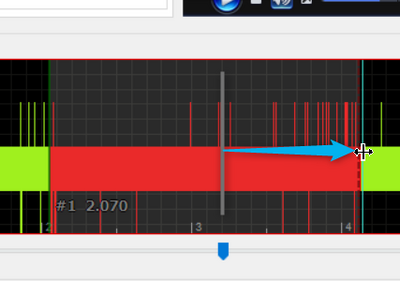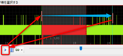 - 動画を再生しながら、字幕をつけ始めたい箇所を探す。○で囲った青いマークがシークバーの役割で、これを左右にスライドさせることで曲全体の中の長さの割合に合わせた時間の部分が表示されアクティブな状態になります。アクティブというのは○で記したところからの矢印の次にある四角で囲った再生ボタンを押すと、その部分の時間にあった音から再生が始まります。薄い青色の縦線がアクティブな位置を示します。再生をするとアクティブな位置が右へ右へとスライドしながら再生がされ、もう一度再生ボタンをの位置のボタンを押すと停止します。字幕を開始したいところを音や映像を見ながら決めましょう。字幕を出したいポイントの歌詞のように少し前くらいのところで表示するパターンと発言ないようの文字おこしのように同時に出すパターンがあると思います。うまい位置を見定めてください。後でも位置調整はできるのでまずはざっくりで良いでしょう。