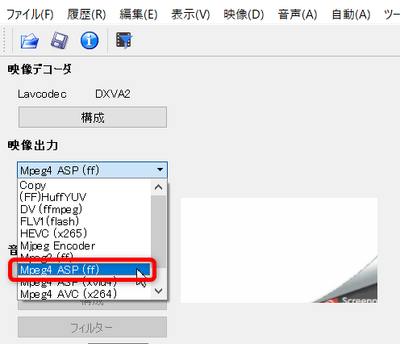 - ビデオ部分のcodecを選択する(ffmpegのmpeg4がいいかなと思って選択しましたが、これから先の作業もできるなら、他の形式でもいいです。)