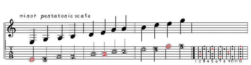 え、その前にペンタトニックって何?ふんふんふん。あー。そーいうことか。あれだ。ペンタが5を意味していてトニックは育毛剤じゃなくて、主音を意味しているっぽいな。ふむふむ。いわば、E Minor5主音スケールということです。主音とは何かはもっと先にわかります。今はひたすら上記のタブ譜のとおり弾いて覚えよう。