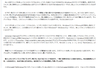 Windowsで游ゴシックやヒラギノフォントを使うと汚いというか、滲む(にじむ)というかか、変な感じになってしまいます。これはWindowsのフォント設定がmacOSの標準フォントの設定とが異なるためと言われています。少し大きい目のフォントサイズ(1.13em、113%、あるいは17px以上)で使わないとmacOS同等のようなきれいな描画はされません。この原因は一つにはRetinaDisplayの高解像度による滲みの低減作用。もうひとつは、文字のウェイト設定がmacOSではweight400が標準になっているのに対して、Windowsでは300が使われているようです。つまり細めになっているので、細くなりすぎると、より繊細な演算をしないと表示がおかしくなるというものですが、繊細な演算はできない(多くのブラウザ、chrome、Edge or IEとか…)からです。Microsoft Office関連のアプリはうまいこと描画できている気がします。Windowsを普段から使っている人からするとmacOSのフォントは少し太く感じるはずです。最近はWindowsでも高DPIで使うことも多くなっているので、少しは改善されているはずです。ちなみにWindowsにはヒラギノフォントはついていないので、株式会社SCREENグラフィックソリューションズ(大日本スクリーン製造の子会社:スクリーングループ)から購入する必要があります。自分は25年くらい前に購入したものですが、W1(200),W3(400 標準), W4(500), W5(600),W6(700 bold相当)を持っています。すっげ、高かったっすけど、小さいフォントではあまりきれいじゃない。意味わかんねぇ。Windowsでは使うなと言っておいて欲しかった。でも自己満足な場面では、フォントサイズを少し大きくして使いますので、美しいフォントが使えるし、よしとします。
