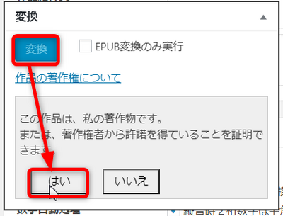 他にも設定が必要な場合は各種入力項目で調整をします。すべて入力したら、変換ボタンを押下します。変換ボタンの横に「epub変換のみ実行」というチェックボックスがありますが、このチェックを入れるとmobiファイルが作られないことになります。その後、このエリアが広くなって著作権に関する確認の質問が表示されますので、問題なければ「はい」を選択します。変換が始まります。