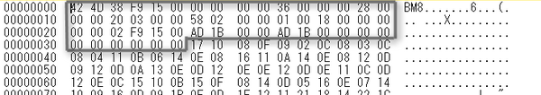 34~37 4Byte:画像データ部分の情報容量[バイト]。適当な値が設定されていることもあります。適当というか、間違えた計算に基づくファイル容量の値だったりということです。0が設定されていることも多いです。