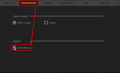 キャビネットは実際のライブでは現物があるはずですから、Bypassした方がよいと思います。そんなときのためにいちいちキャビネットなしのプリセットをつくらなくても設定画面からキャビネットをBypassする設定があります。