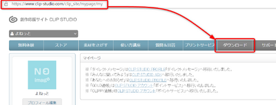 - ClipStudioのWebSite(Topページ、Topページ2、マイページ(アカウント所有者のみ))から「ダウンロード」を選択します。