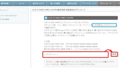 - そうすると追加素材を入手する特別なページに遷移します。ここでシリアルナンバーを入力して、その横の認証ボタンを押します。シリアルナンバーは製品を箱で購入した場合は箱の中にシリアルナンバーが記載されているモノが入っていますので、それを。バリュー版、ダウンロード版は水色の枠のリンクから確認できます。amazonアカウントで購入した人はメールに記載されているそうです。