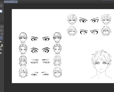目を描くに挑戦。通常、キリット、猫、たれの4種類。目の輪郭だけでだいぶ印象が違うきゃらに代わる。でも教則本の髪型もそれに似合う髪になっている。ずるい。フルハイビジョンのピクセルで300dpiとして作業してきたが、モノクロだと細かいところがうまく描けないので1200dpiにした。それでも厳しい。なんか間違ってるんかな。