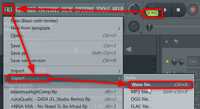 - Song再生設定であることを確認して、[File]-[Export]-[Wav]からエクスポート処理を開始します。