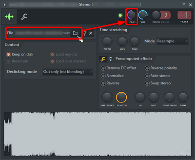 - クリップにFL Stuidoで読み込み可能な形式の音声ファイルを取り込み、パンを振り切る。例では左チャンネル抜き出しの意図で振り切り