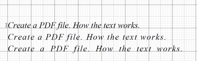 方眼紙になっているので、文字列が50ポイント置きに配置されていることがわかります。ポイント単位で細かく文字を配置できる気配がします。そしてテキスト状態を変えるオペレータを記述すると最初は文字列の間隔が変わり、次に単語単位の間隔も帰れました。英語の斜体文字のグリフの扱いは複雑なので、どこがどれくらい広がったのか、論理的な説明は難しいので、ここでは、だいたい変化させれるということにとどめておきます。おいおい、検証することにしましょう。
