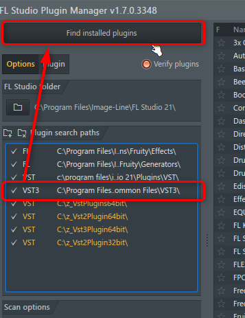 開発したvst3ファイルは、VST3 PluginHostTestと同じく、C:\Program Files\Common Files\VST3に配置すると良いです。このディレクトリを実際に使う人は少ないと思いますし、それでいて、各DAWのデフォルトでの読み込み対象にすべきフォルダとして指定もされている最強のフォルダなのです。開発用に使っちゃえばいいじゃんと思います。もちろんFL STUDIOも規定値で参照してくれるフォルダになっています。
