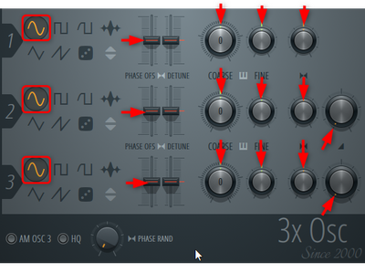ではFL STUDIOを起動してみます。そして、新規にチャンネルラックに新しいInstrument trackとして、FL謹製のInstrumentsの3x OSCを呼び出します。ピアノロールでC5に4小節にまたがるようなロングトーンを配置します。そして、3x OSCの波形生成部分の1~3のいずれもサイン波形を選択します。いっちゃん左上のマークです。それ以外のつまみは全てゼロに合わせます。これでサイン波形のピーって音が鳴ります。PluginHostTestのsineを選択したのと同じ動作です。