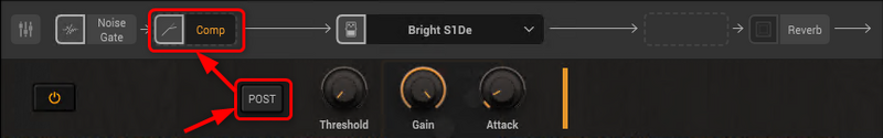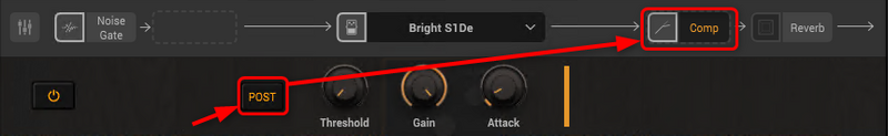 同じ要領でCompressor(音量持ち上げ)とReverb(反響)も調節できます。CompressorはPOSTの有効無効によりCompressorの位置を変更でき、無効なら NoiseGateとModelの間にCompressorが配置され、有効ならModelとReverbの間に配置されます。