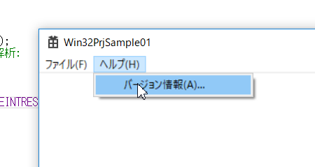 - 4.デバッグを開始しましたが、今のところはまだ、Win32アプリが動いただけです。ブレークポイントを設定した箇所は、このウィンドウでヘルプのバージョン情報を選択したときに呼び出されるコードに設定したからです。では、さっそく、「ヘルプ」-「バージョン情報」を選択しましょう。すると以下のような画面になり、設定した場所でプログラムが停止した感じになります。