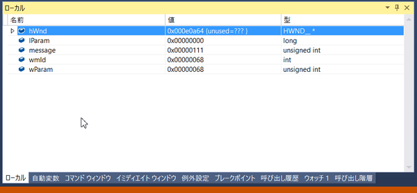 - 5.1行分の命令(実際にはセミコロンで区切られる命令の区切りごと)を実行するには、キーボードの[F10]キーを押しましょう。ステップオーバーと言います。今実行している関数が終わったところまで進む場合はキーボードの[Shift]+[F11]キーを押しましょう。ステップアウトと呼びます。今回の場合はWndProcというメッセージ関数の中でブレークポイントを設定しているので、ステップアウトすると、それ以上はプログラムを見ることはできないというようなメッセージが表示されると思います。そしたら、キーボードの[F5]キーを押して、Win32アプリが動作している状態にするしかないです。デバック中のF5は続行という意味ですので、次のブレークポイントまで進むか、Win32アプリがメッセージを受け取るのを待つかの状態まで進みます。現在の行が呼び出す関数の中身に移動するときはキーボードの[F11]キーを押しましょう。ステップインと呼ぶ動作になります。関数の中身がのぞける場合はその関数が記述されているファイルがエディタ画面で開いて、また一行づつ、命令を実行するか、命令の確認する方法を選択できます。ブレークポイントはプログラムの複数の場所に設定することができますので、確認したい場所にうまくブレークポイントを設定するのが、素早い動作確認をするコツにもなります。WndProcが何かということについてはW32プログラムの記事などでのプログラムの説明でWindowsアプリの仕組みを理解しないとダメだと思います。