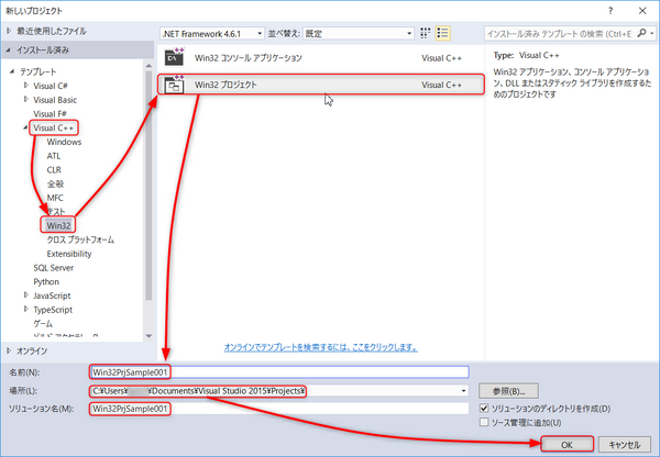 - プロジェクトの名前とプロジェクトの作成するフォルダを選択する必要があります。プロジェクトを保存する場所は、昔はスペース空白文字は嫌がられていましたが、最近はスペースを含めても良いので、フォルダのパス全体を通して、アルファベットのみを使い、記号はあまり使わない名前だけにした方が無難です。いろいろな外部のプログラムを参照する関係で、日本語文字があるとうまく動作しない場合は多いです。あれ?おかしな?と思ったら、全角のC++フォルダの中にプロジェクトがおかれていたりといこともあります。C++としたい気持ちもわからないでもないですが、Cppとかにしましょう(CXXとするのもいかしたネーミングセンスかもね)。フォルダ階層が深いとかっていうのも、ハマる原因になることもあります。プロジェクトの名前も長すぎると、プロジェクト名を含んだクラス名(プログラムの中に使われるユーザが命名できる関数の発展したものがクラスです。)が自動で沢山作られる関係もあるので、あまり長すぎない方がいいと思います。プロジェクト名とコンパイルしたりリンク処理したりする際に必要なコマンドラインプロパティも自動で生成されて、プロジェクト名に使われている名称は簡単に変更できるようなものではないです。